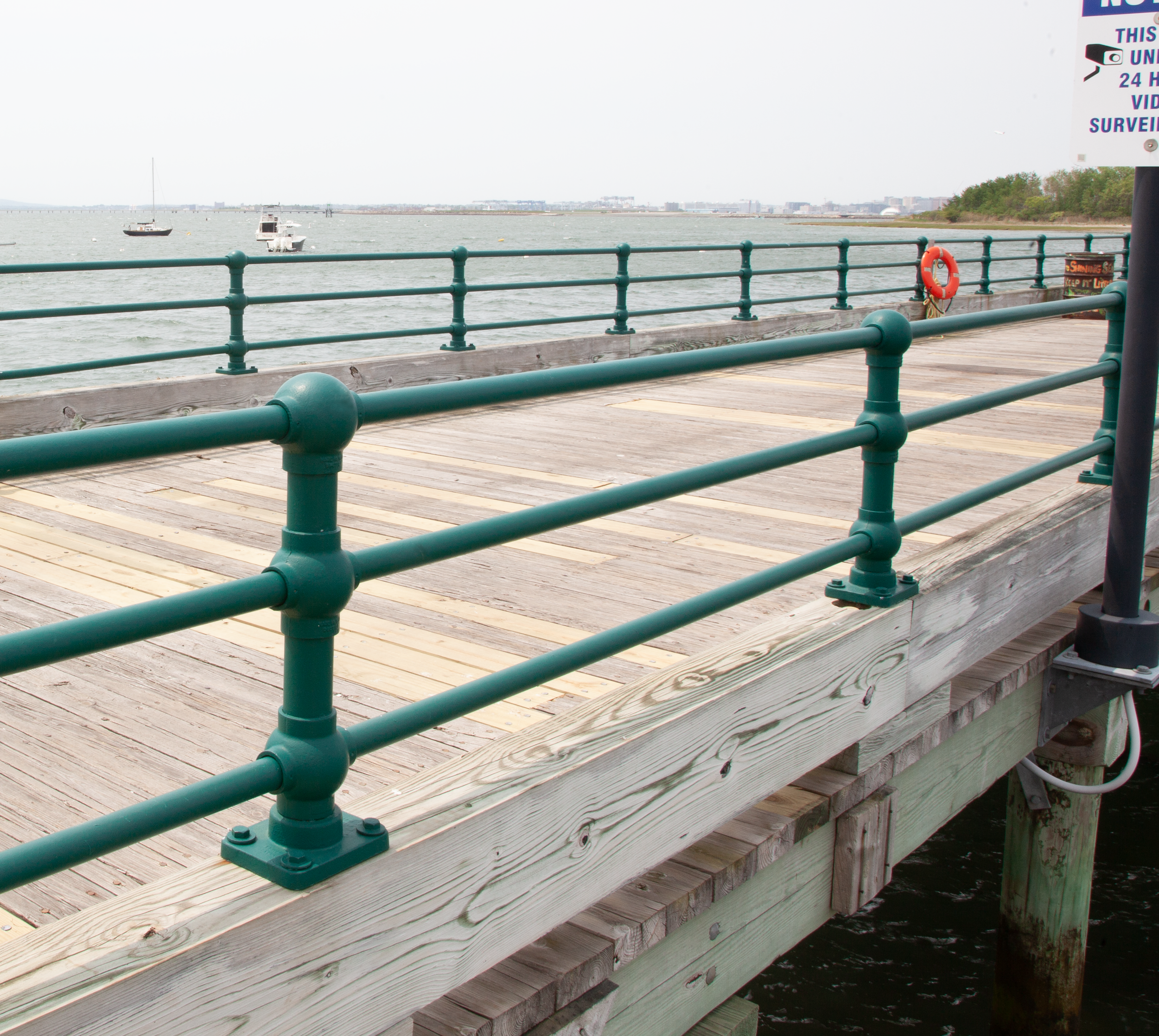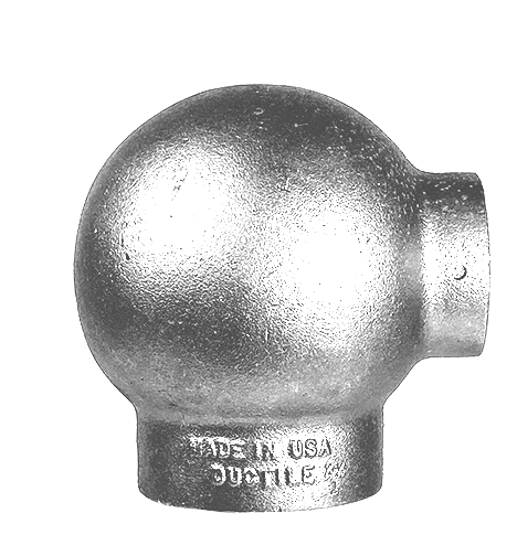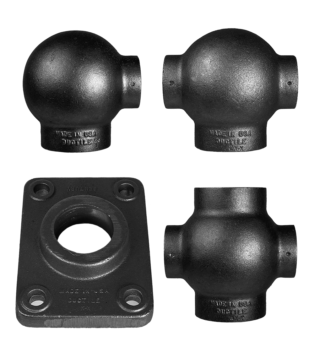 Our Ball Cap fittings are made in the USA of ductile cast iron, which is far more durable than traditional gray iron. Individually, each 2 ½” SCH 40 pipe post resists over 600lbs of force and each 1 ½” pipe rail resists over 300lbs of force.